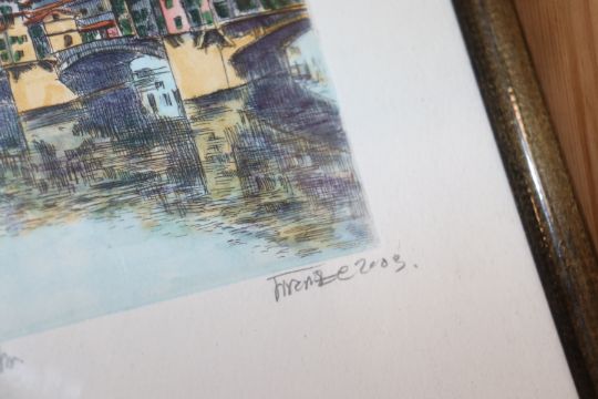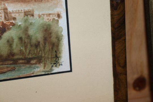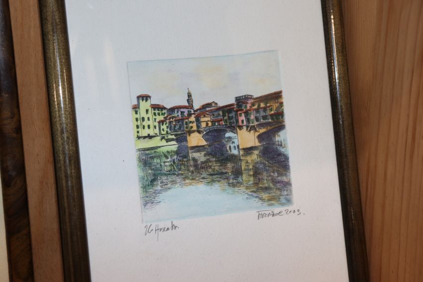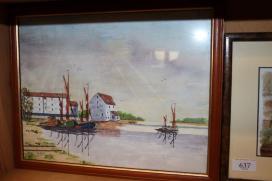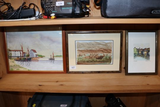 A framed and glazed watercolour study depicting a village, indistinctly signed to bottom right; a pencil signed etching and a watercolour study of Woodbridge Tide Mill