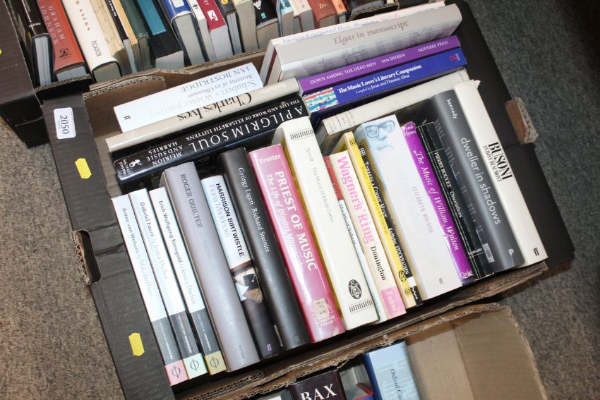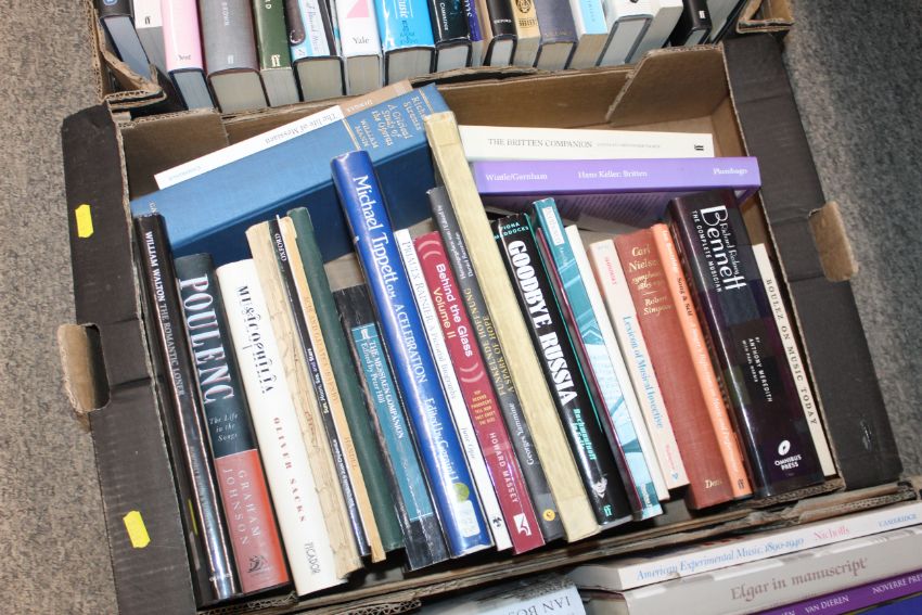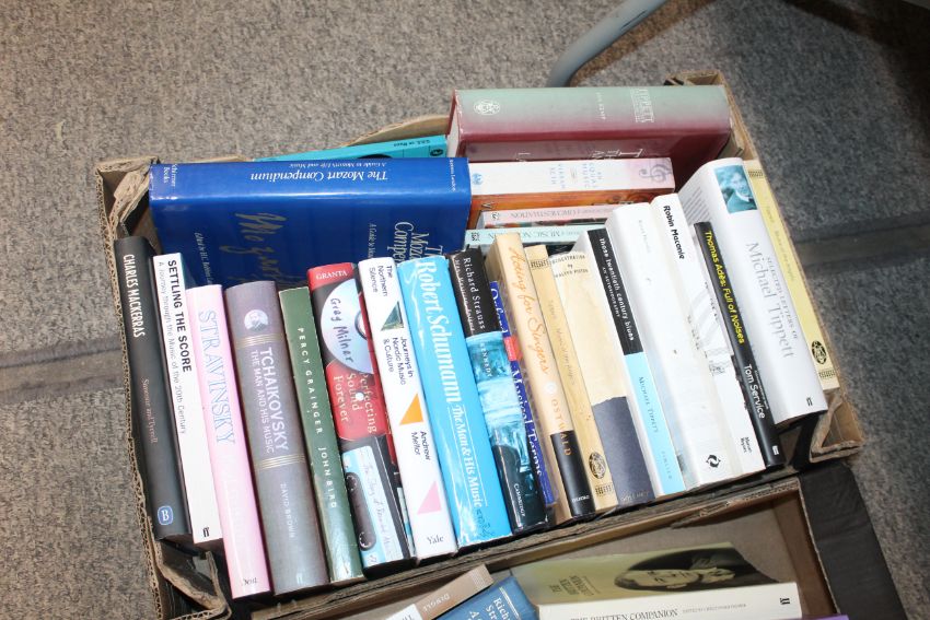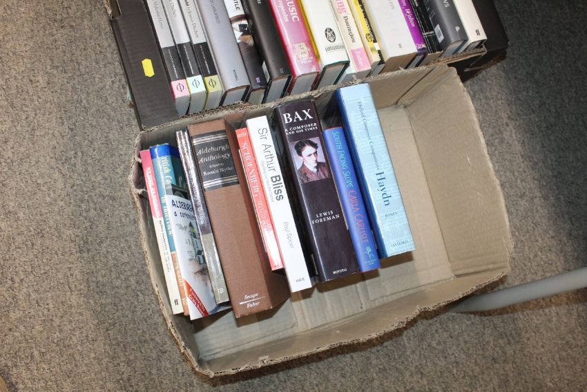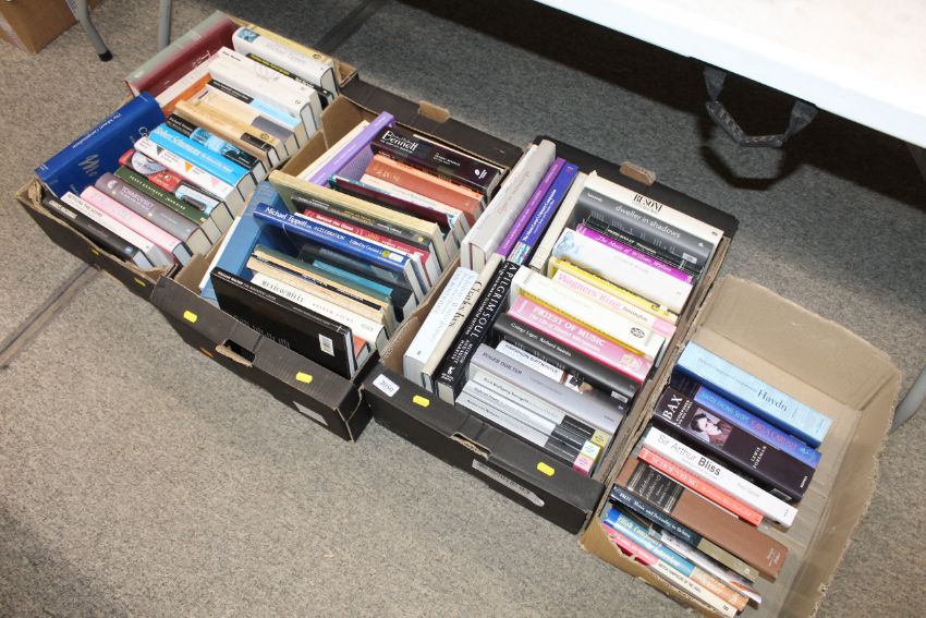 Four boxes containing various musical and other Autobiographies etc.