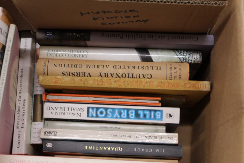 A box of various books including Fiction, Travel etc.