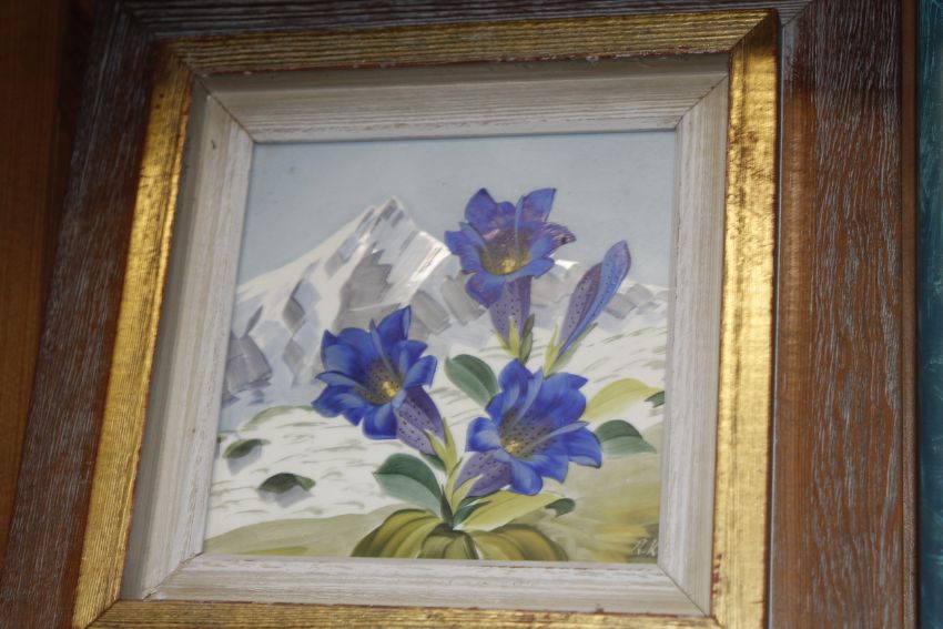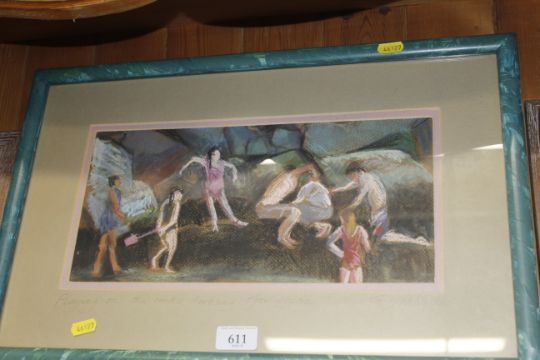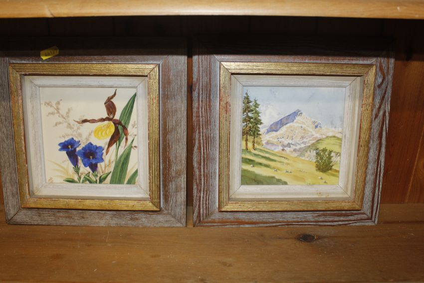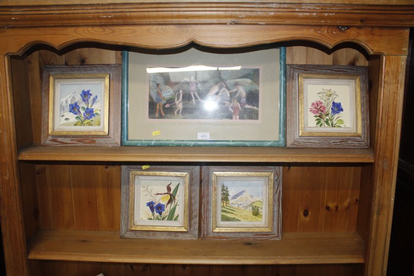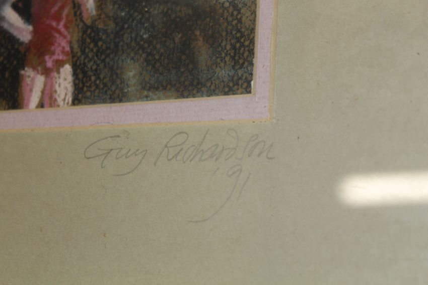 Guy Richardson, framed study "Playing on the rocks looking for crabs" and four framed decorated tiles, some signed