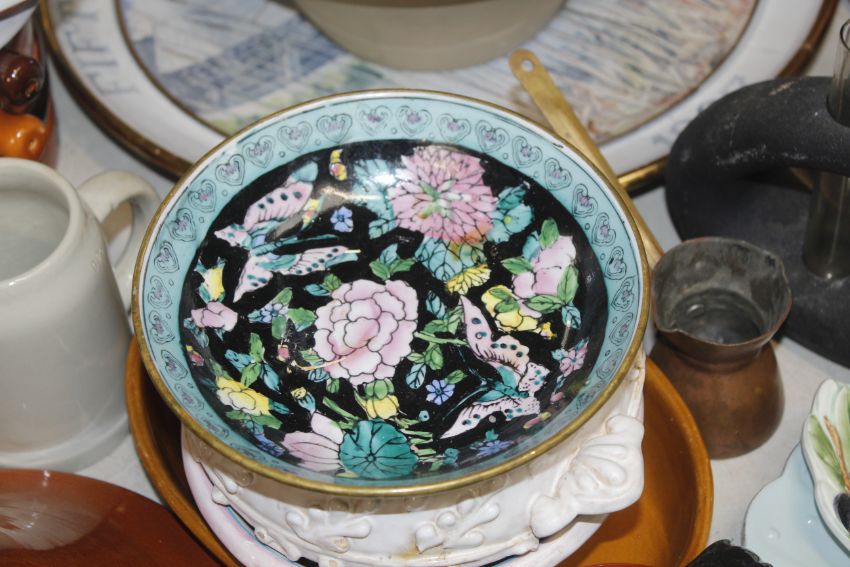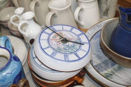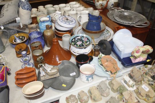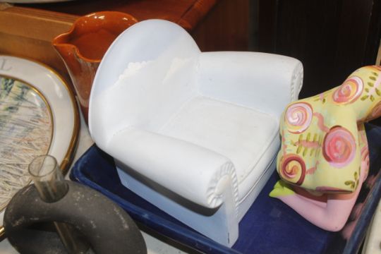 A collection of various pottery to include a model of a chair indistinctly signed; an Aldeburgh Festival charger AF; a pewter dish AF; various jugs etc.