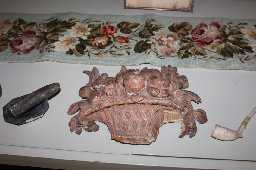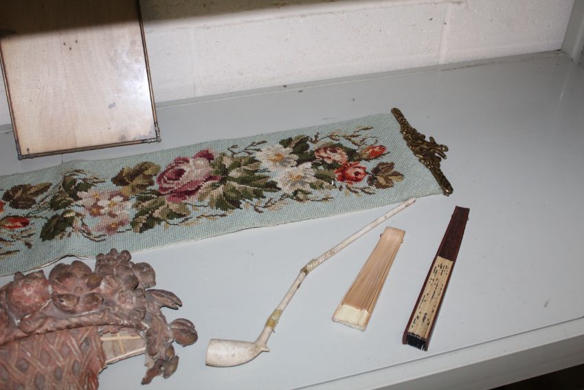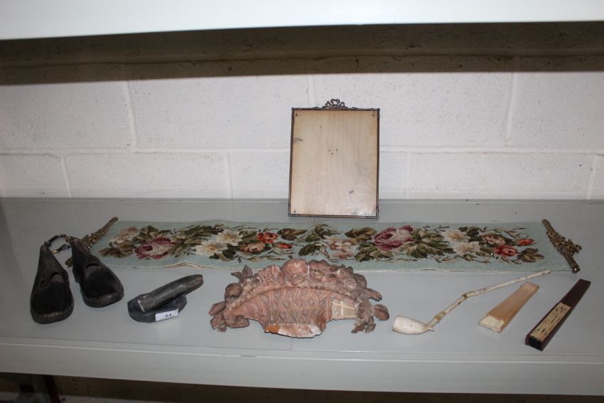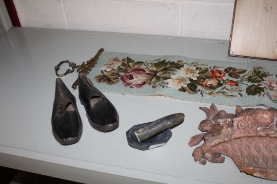 A quantity of various bygones to include a pair of Lancashire leather child's clogs, fans, a stone pestle and mortar etc.
