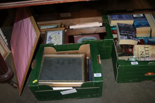 Two boxes containing picture frames and prints etc.