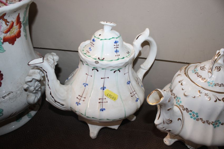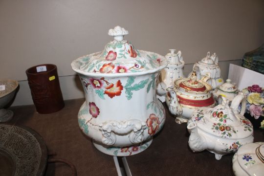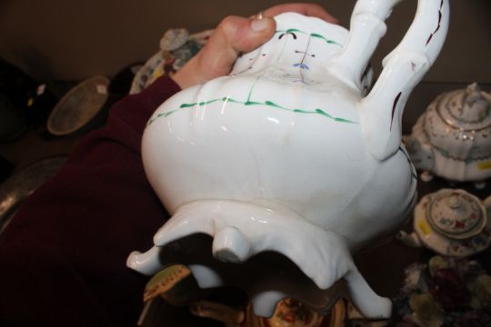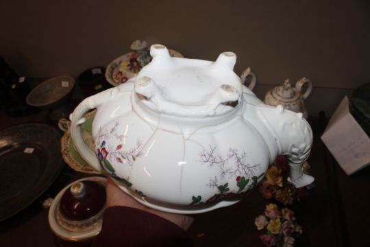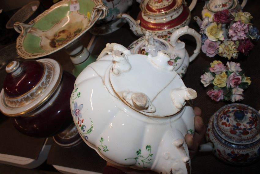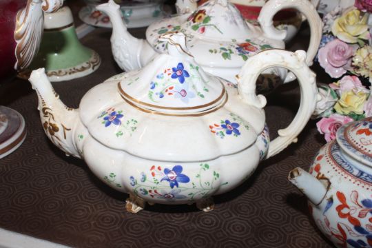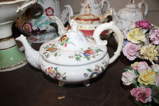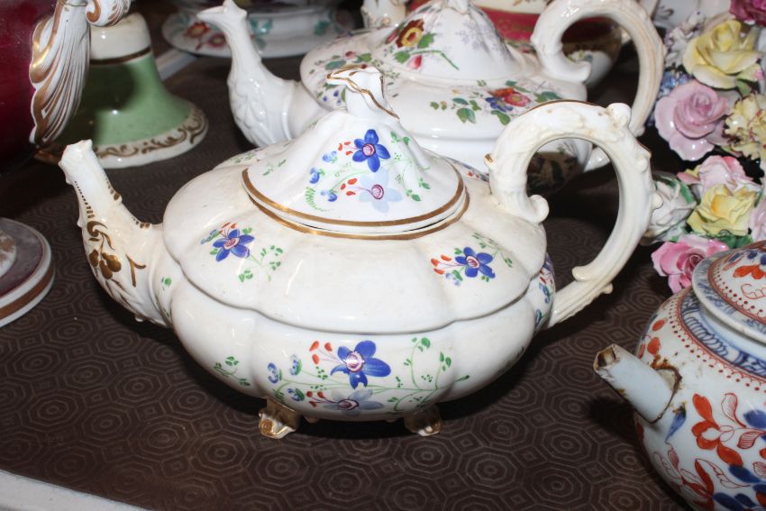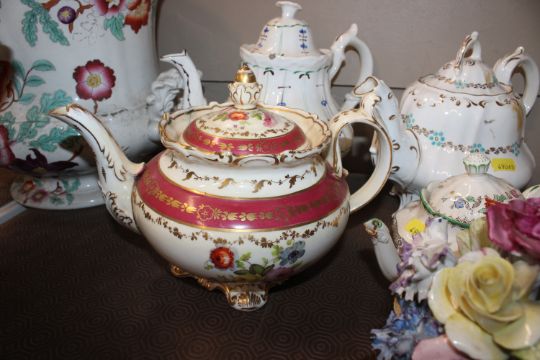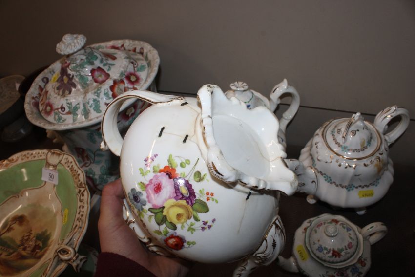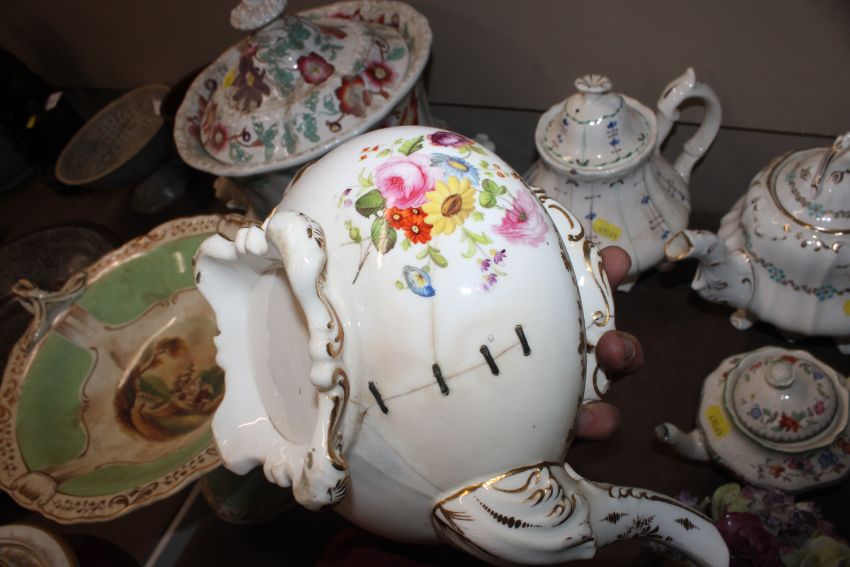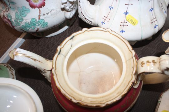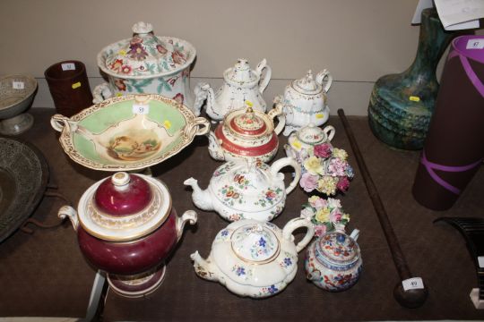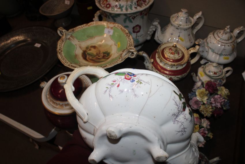 A quantity of 19th Century and later teapots, a soup terrine AF, a comport, an antique teapot AF