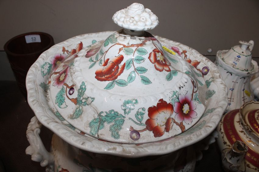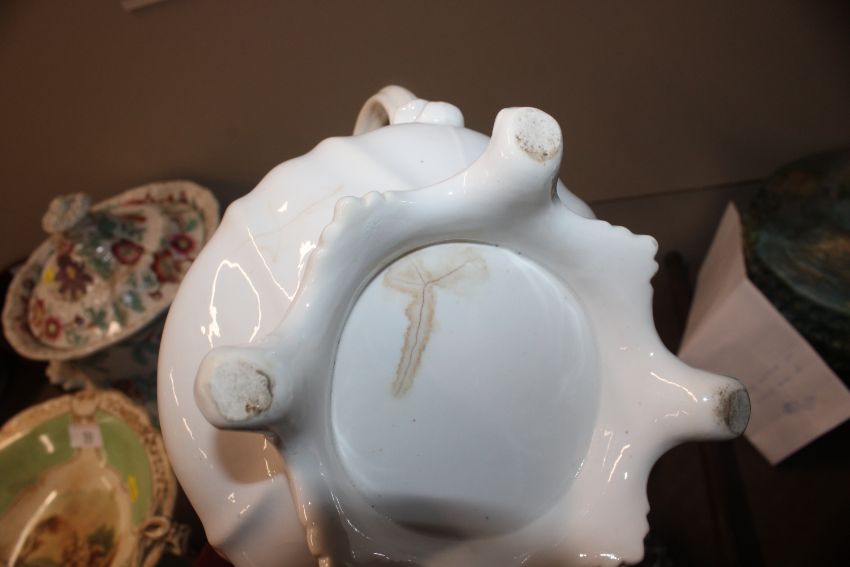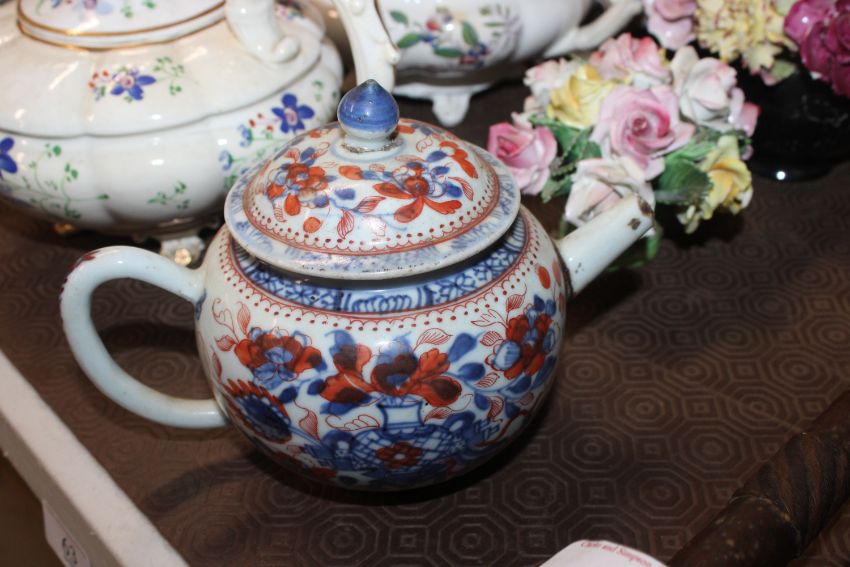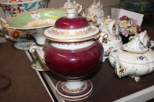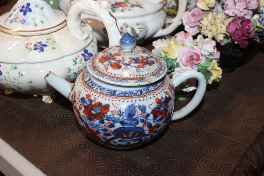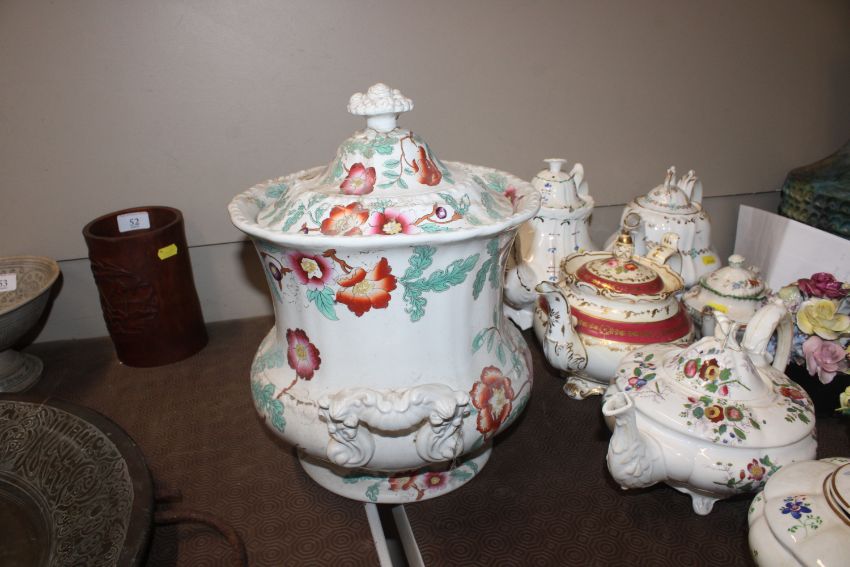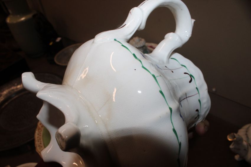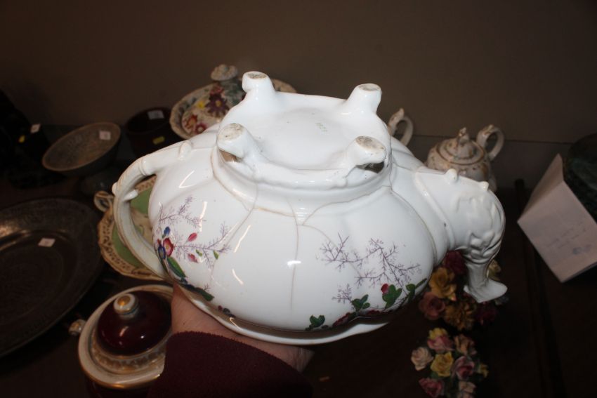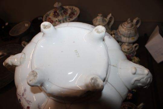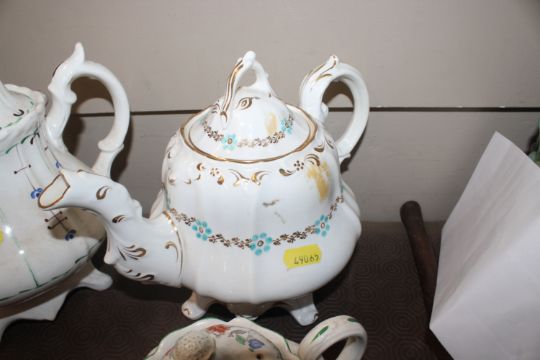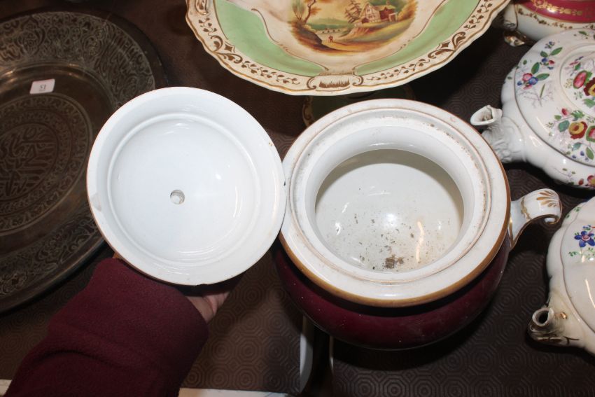A quantity of 19th Century and later teapots, a soup terrine AF, a comport, an antique teapot AF