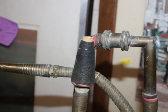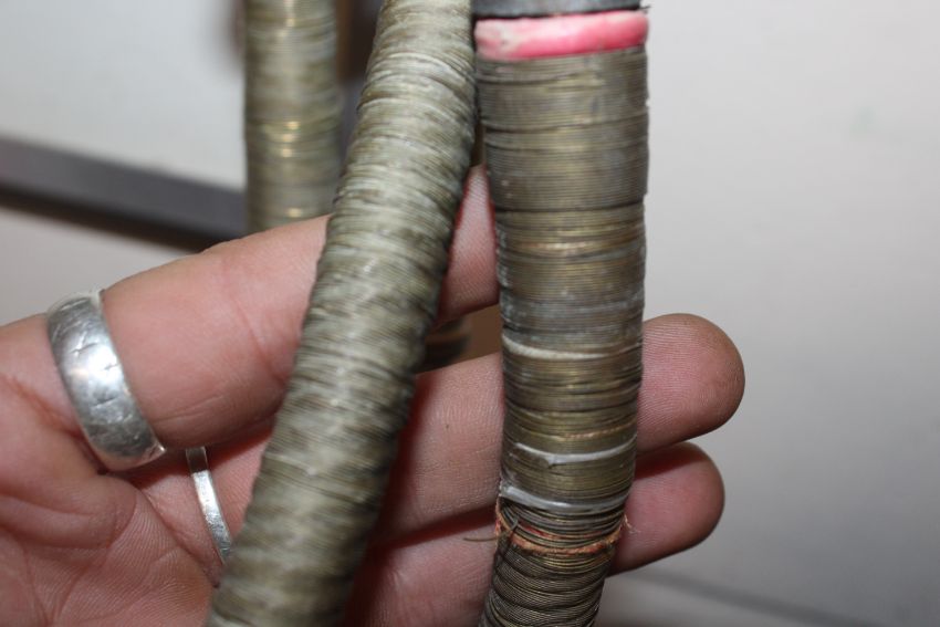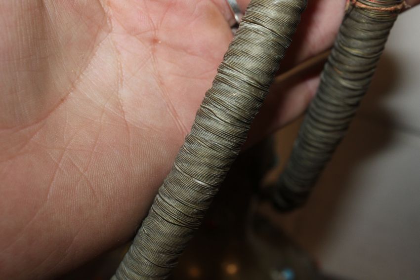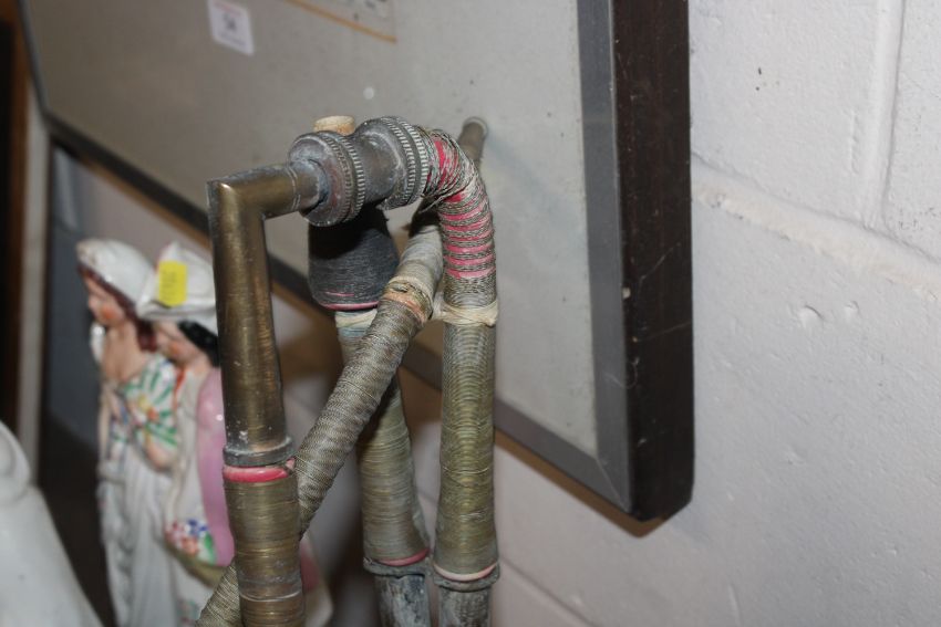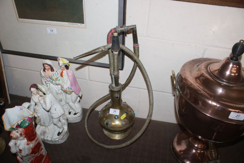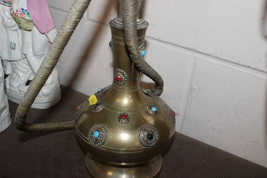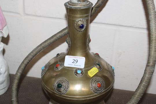 A brass hookah pipe with coloured stone decoration