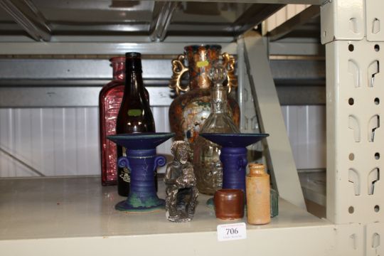 A pair of candlesticks, an ethnic figure, oriental vase, old bottle etc.