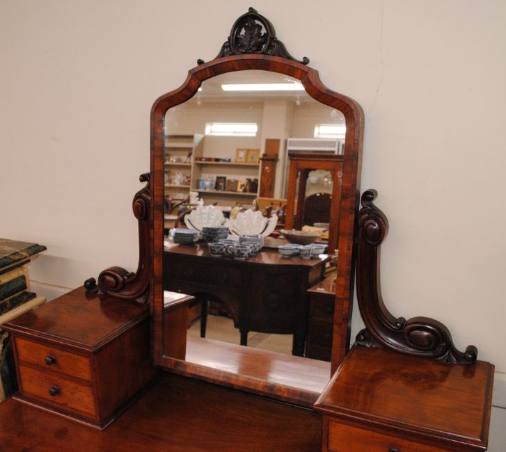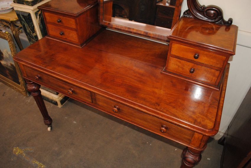 A good quality Victorian mahogany dressing table, fitted with a swing mirror above four trinket drawers, two drawers below raised on turned fluted legs terminating in white porcelain castors, 121cm wide x 58cm deep