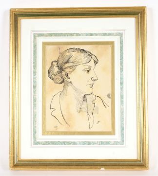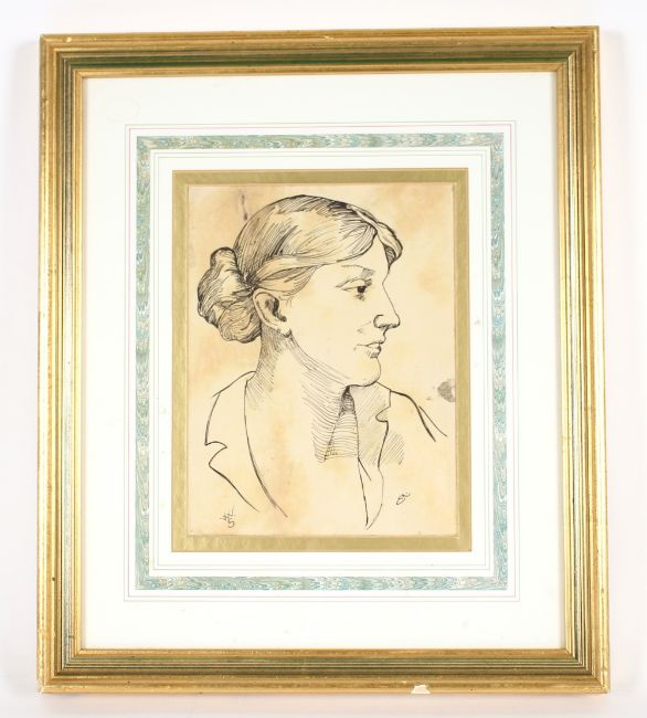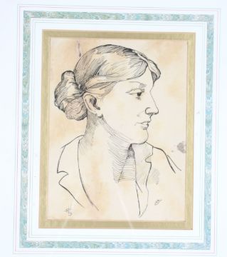 After Elizabeth Melville, pen and ink sketch of Virginia Woolf, initialled bottom left V.W.S. and E.M. to the bottom right, 25cm x 19cm