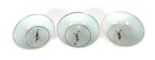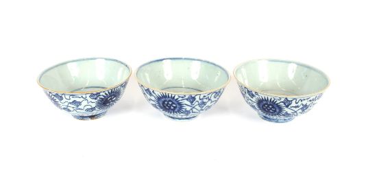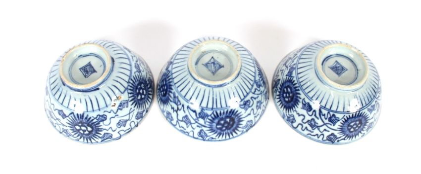 Three large blue and white Chinese porcelain bowls, having floral decoration, seal mark to bases, 18cm dia.