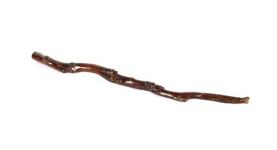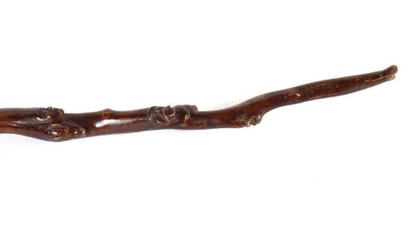 An American Indian Folk Art hardwood walking stick, carved with seven human heads and two animals, 88cm long
