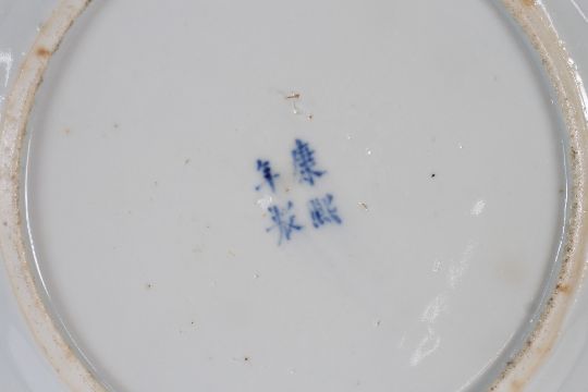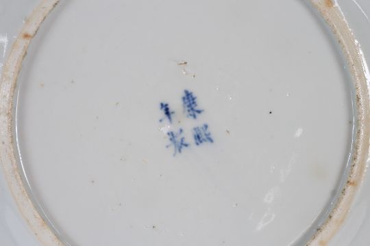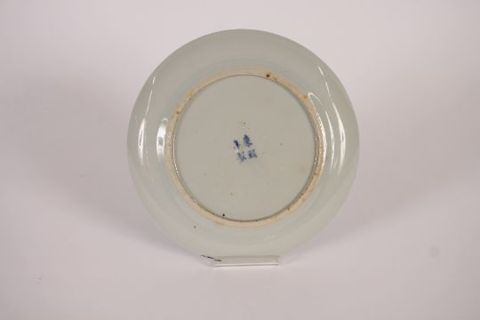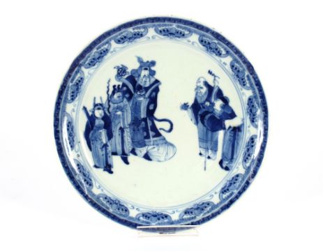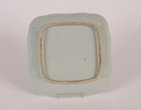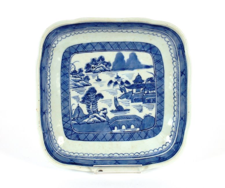 A Chinese circular blue and white shallow dish, decorated with dignitaries and other figures within a bat and insect decorated border, four character mark to the base, 24cm dia.; and a Chinese blue and white square dish decorated pagodas, 22cm