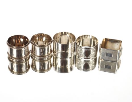 A pair of numbered silver napkin rings, with beaded decoration, London 1889; a square silver engine turned decorated napkin ring and two others, 147.6gms