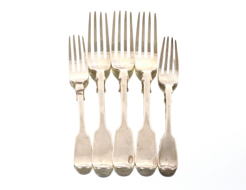 Three Victorian silver dinner forks, crested, London 1856; a matching dessert fork; and another, 325gms
