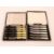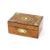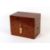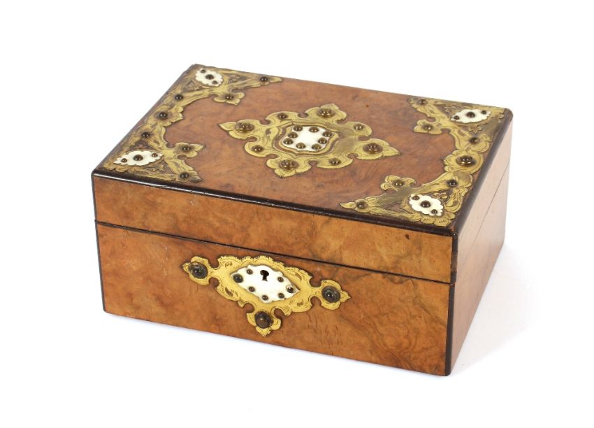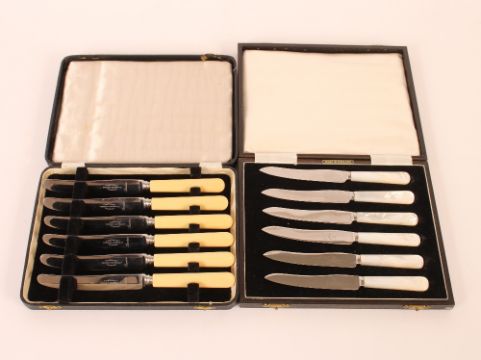 A 19th Century mahogany velvet lined storage box, fitted sunken brass handles, complete with key, 33cm wide x 27cm deep; a Victorian walnut bone and brass mounted sewing or trinket box (interior missing), 27cm wide x 20cm deep; a cased set of mother of pearl handled fruit knives and a cased set of bone handled knives