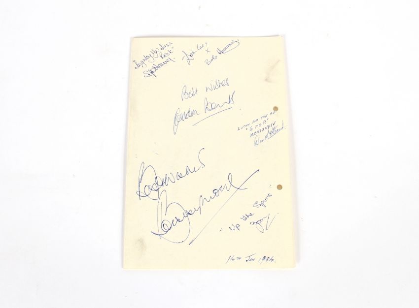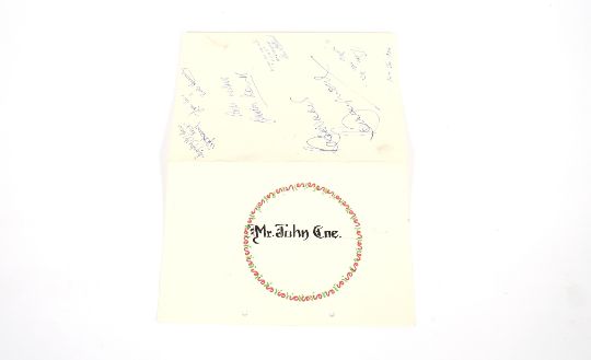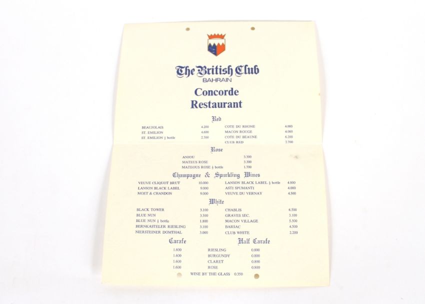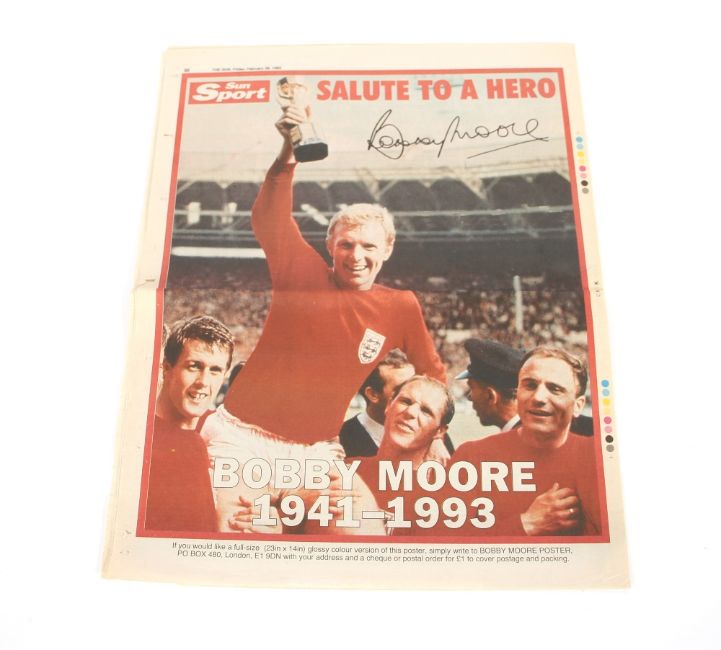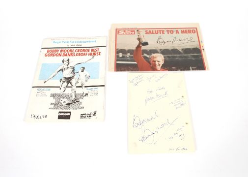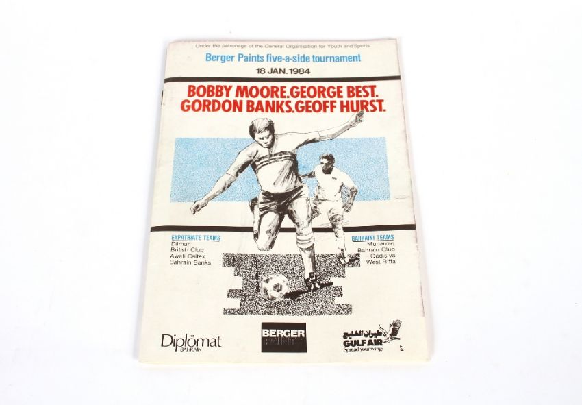 Bobby Moore, an autographed British Club Bahrain, Concorde restaurant menu, also signed by Gordon Banks and a Berger Paints five a side tournament programme 18th January 1984 Bahrain, and a commemorative newspaper
