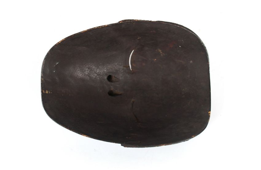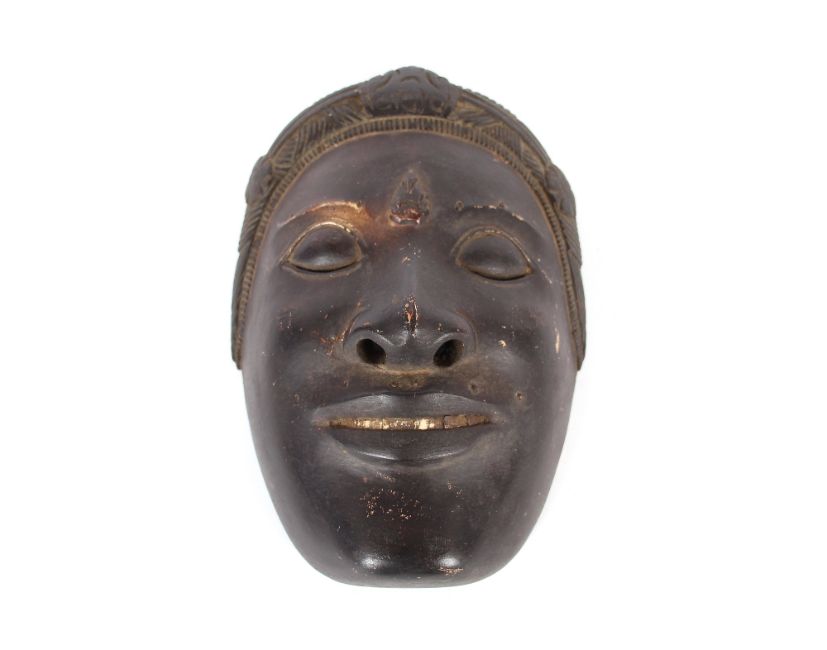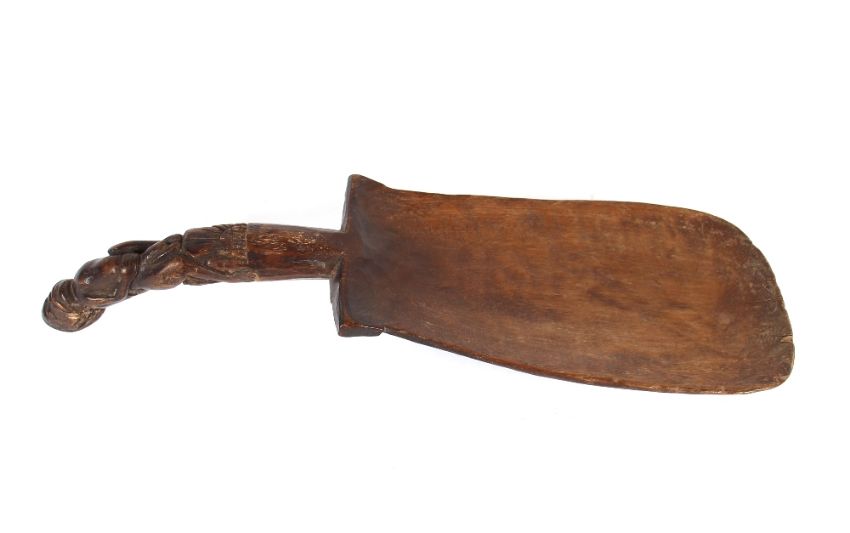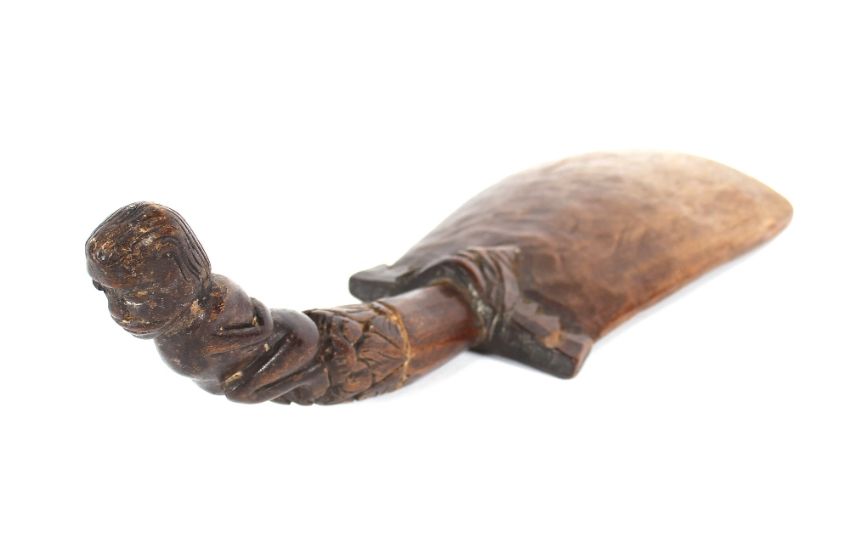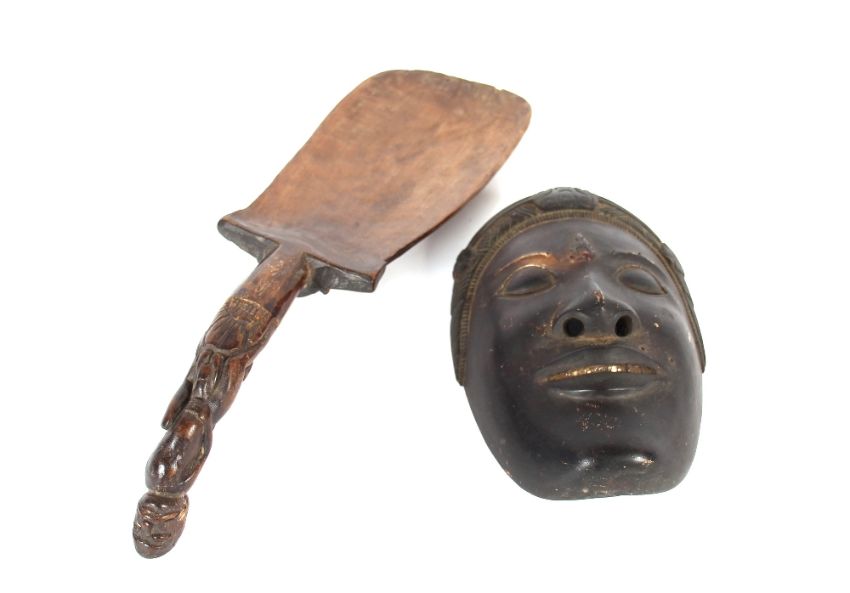 A South East Asian shovel, the grip carved as a naked man, 40cm long; and a finely carved Asian mask 19.5cm long