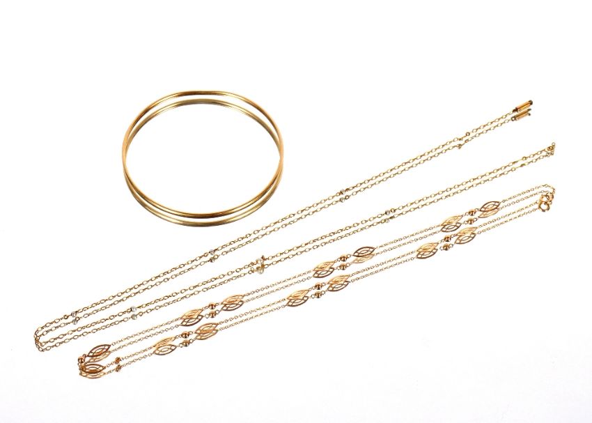A yellow metal necklace, marks rubbed; a 9ct gold bangle 5.5gms and a yellow metal and seed pearl necklace AF, 2.5gms