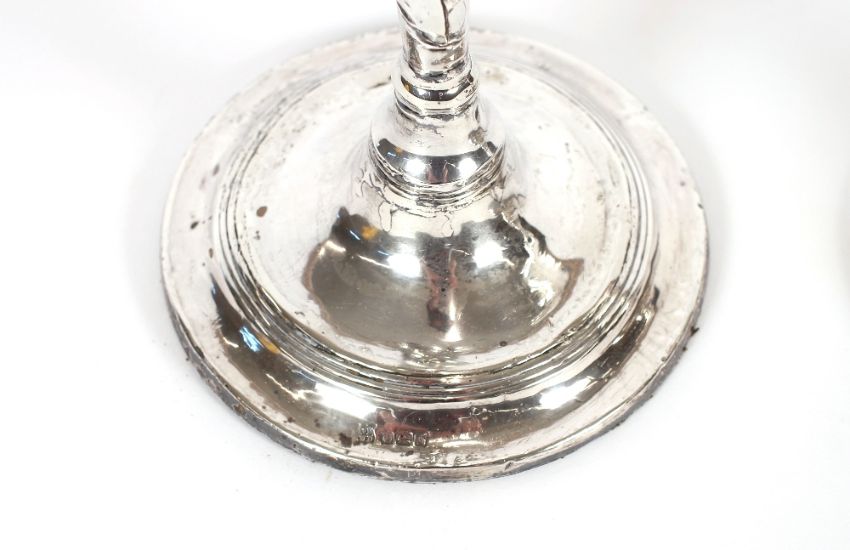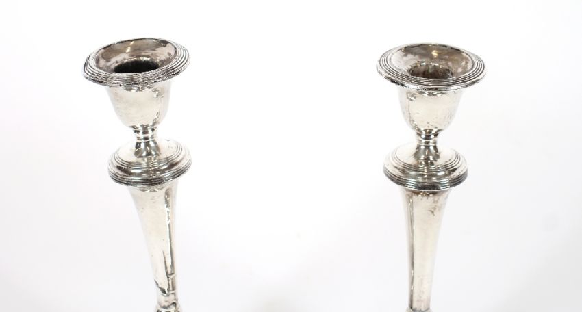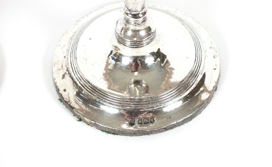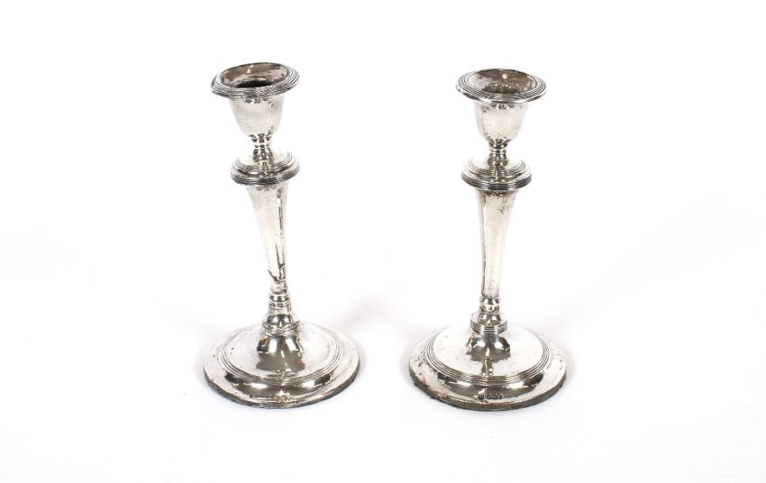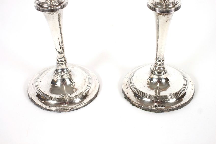 A pair of silver candlesticks, with reeded decoration, loaded bases, Sheffield 1908, 22cm high AF