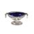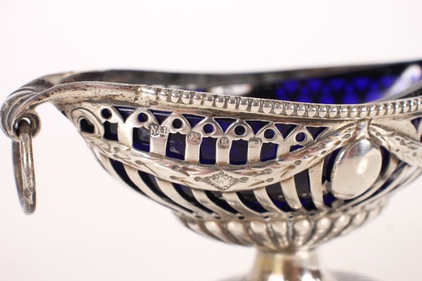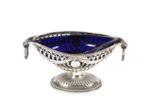 A late Victorian silver oval salt, having and pierced and garland decorated border raised on circular spread foot, complete with blue glass liner, Birmingham 1892, 13cm, total weighable silver, 90.4gms