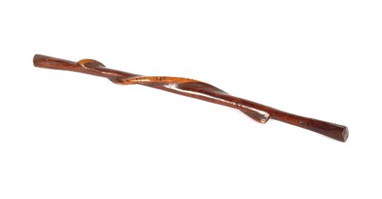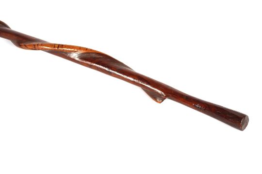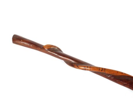 A hardwood stick, with snake climbing up the shaft, singed decoration to the snake, 92cm long