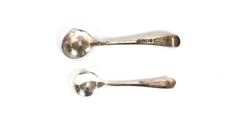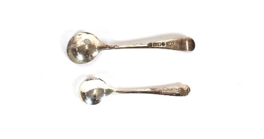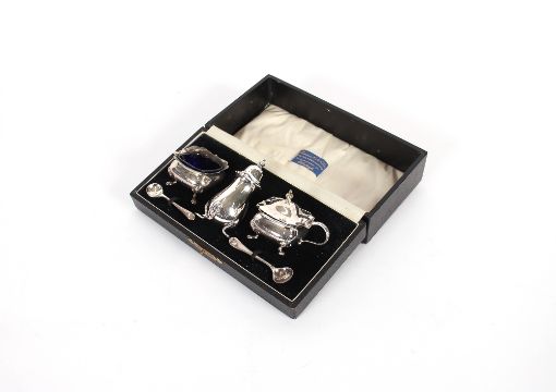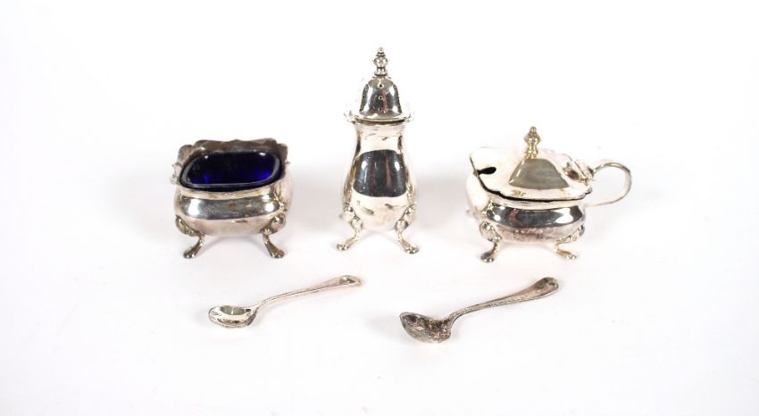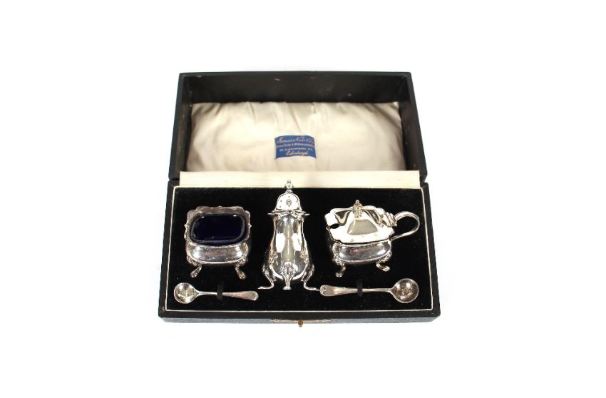 A George V cased silver salt, London 1932, a plated mustard pot and pepper having odd spoons, total weighable silver 24.26gms