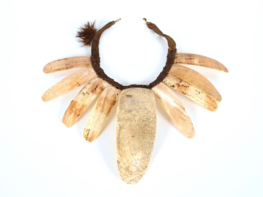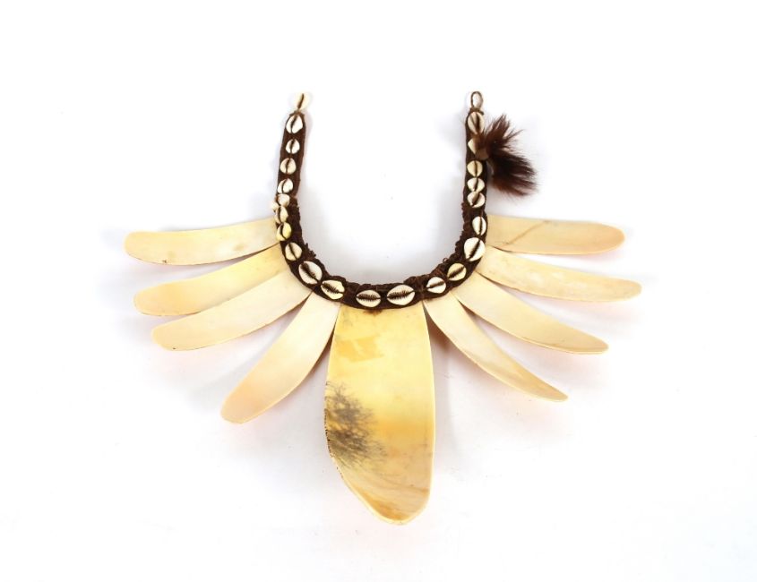 A woven fibre and applied cowrie shell African necklace, with large graduated carved shell lappets, largest lappet 21cm long