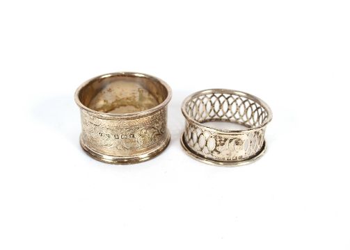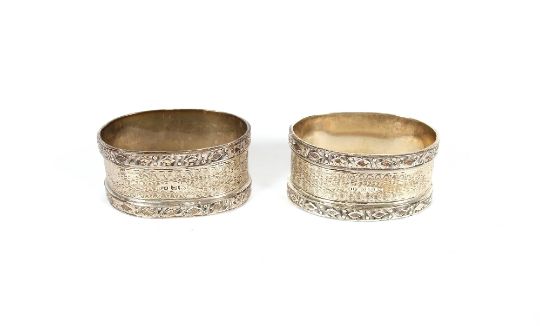A pair of good quality silver engine turned decorated serviette rings, three others 141.7gms and a small silver mounted circular photograph frame