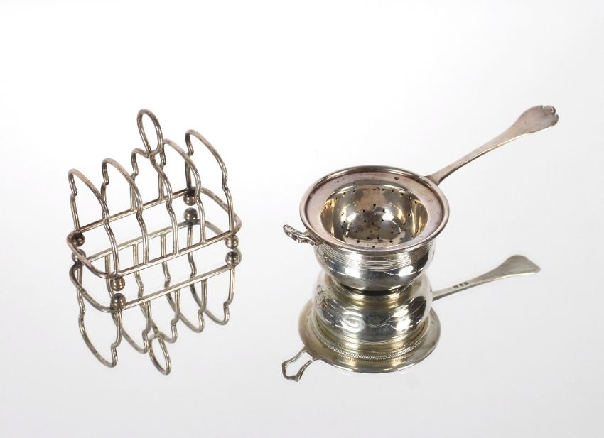 A silver tea strainer and bowl, London 1928/29; and a small silver four division toast rack, Sheffield 1905 AF, 92.5gms
