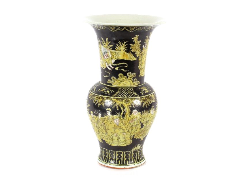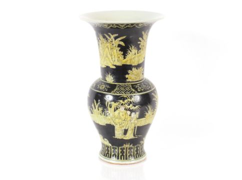 A 19th Century Chinese porcelain Famille Noire and yellow ground Yen-yen vase, painted with flowers, precious objects and figures, 37.5cm high