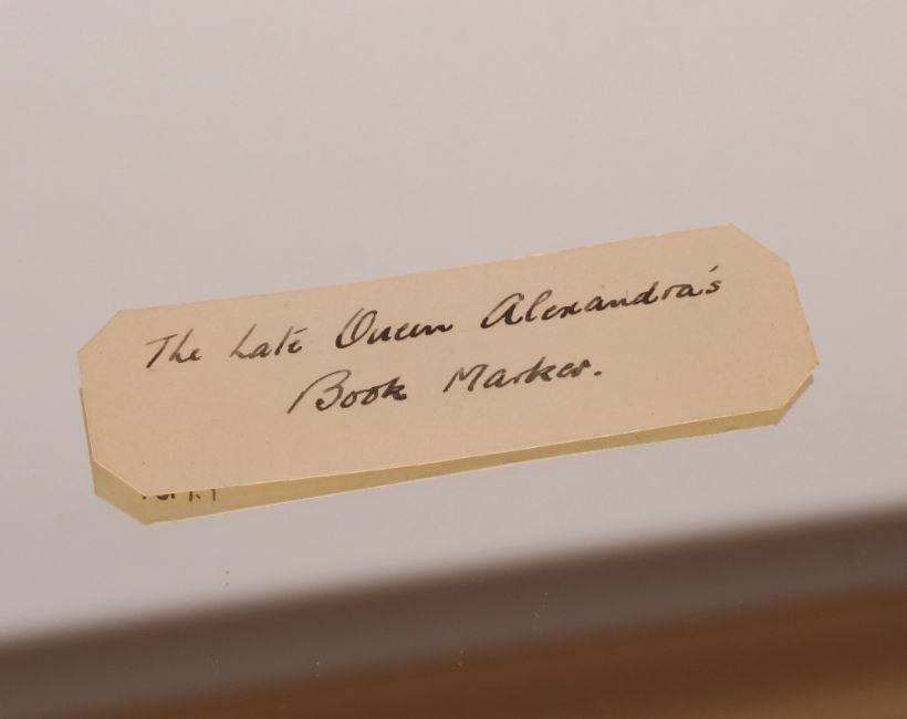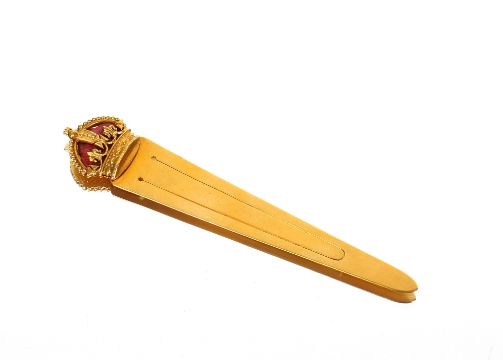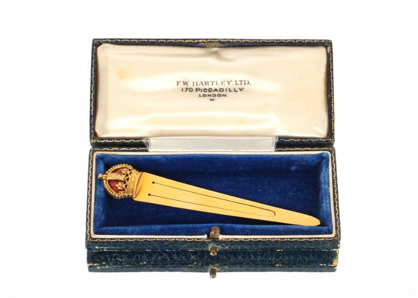 A yellow metal bookmark, with enamel decorated crown, tested as 14ct gold, 8gms total weight, in case by F.W. Hartley Ltd, 170 Piccadilly, London, and bearing piece of paper, 'The Late queen Alexandrea's bookmark'