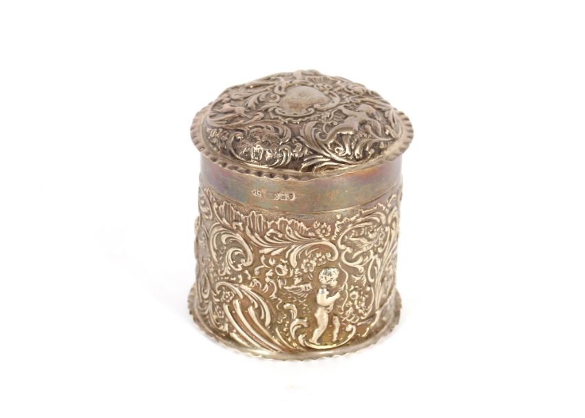 A late Victorian silver cylindrical dressing table box and cover, by The Goldsmiths and Silversmiths Company,  profusely decorated foliate scrolls and cherubs, London 1898, 8.5cm high x 8cm dia.. 121.1gms