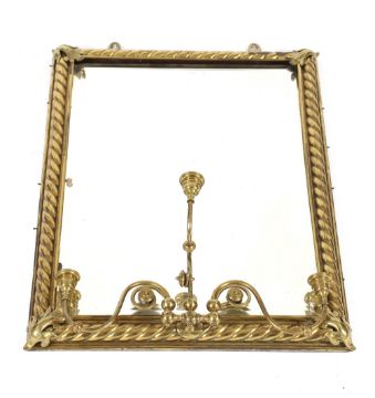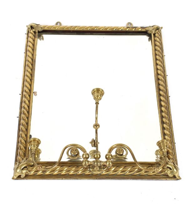 A brass framed wall mirror, fitted with triple candle sconces, rope twist border and foliate scroll decoration, 62cm x 46cm