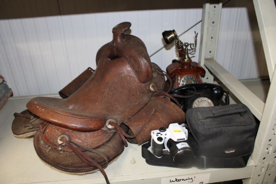 A rotary dial telephone; a wooden telephone; a Fujifilm camera with bag together with a horse saddle