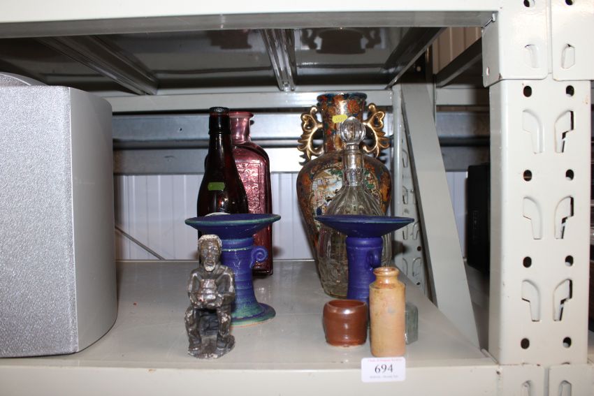 A pair of candlesticks; an ethnic figure; an Oriental vase; old bottles etc.