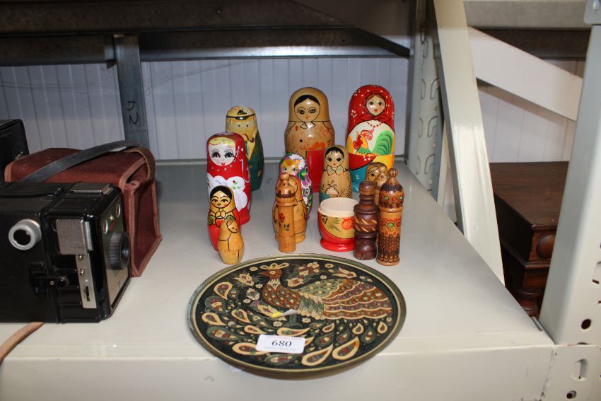 A quantity of wooden Russian dolls and a peacock decorated plate