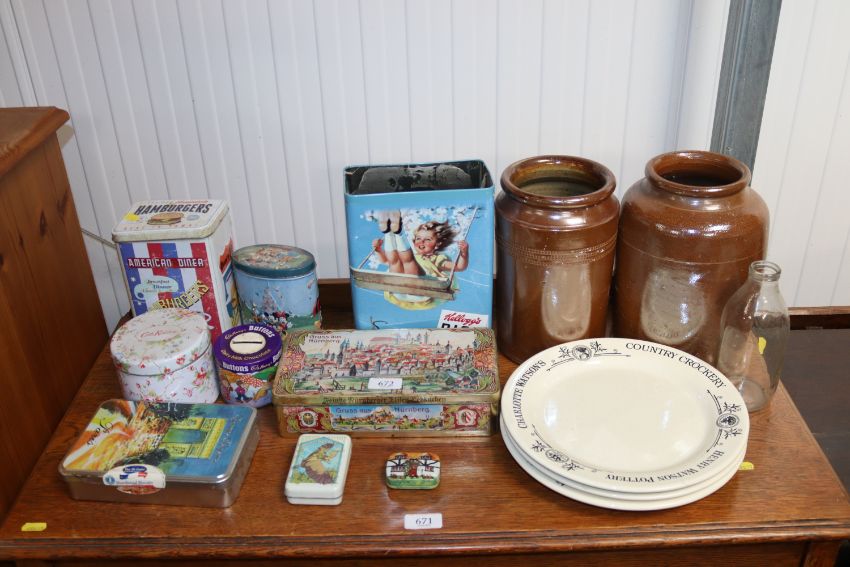 A quantity of various advertising tins, Henry Watson pottery plates, stoneware jars etc.